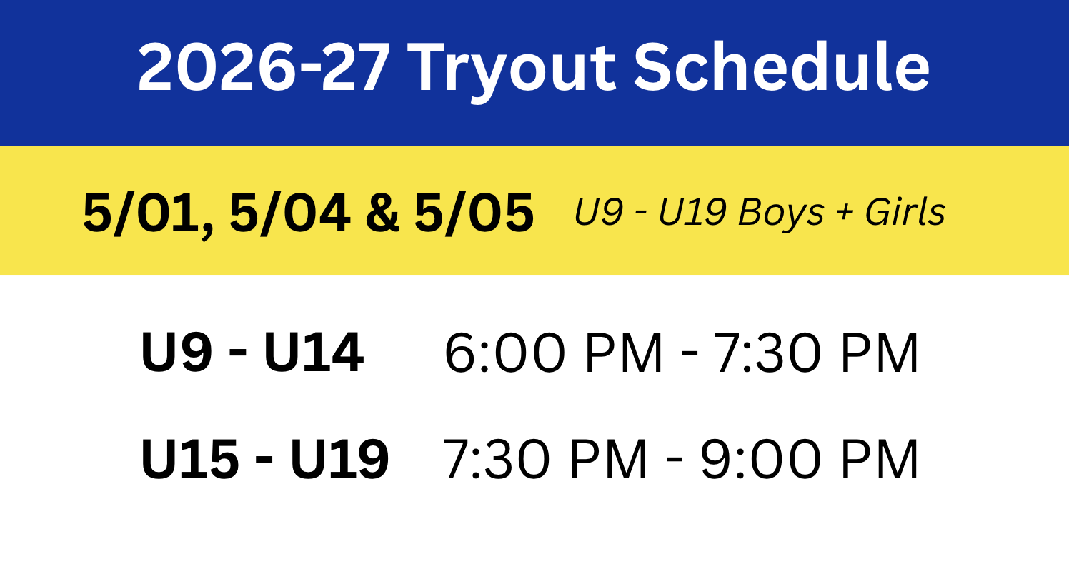 Players should arrive 20 minutes early for check-in wearing soccer attire (cleats and shin guards are mandatory).